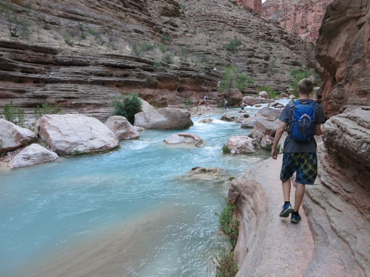 Throughout the trip, he didn’t resist challenge (never a complaint), didn’t worry about outcomes (at least he didn’t voice them), and seemed to instinctually move toward things that were a little uncomfortable to him. While he was reluctant to go through the legendary rapids, he held on tight and celebrated success. During our numerous hikes through side canyons, he rose to the challenge of scrambling up rock and negotiating big exposure. He even got up at 4:30am to do the challenge hike to Havasu Falls to see the turquoise water rush whimsically through the canyon. While somewhat scared of heights, he jumped off cliffs into the flowing river and into pools below falls, beaming with excitement with each accomplishment. During our silent group hike through a mystical canyon, he sat down, took his flute out of his backpack (our guide suggested he bring it along) and played (despite being shy about playing in public); the melodic sound reverberated off the walls and into my heart.